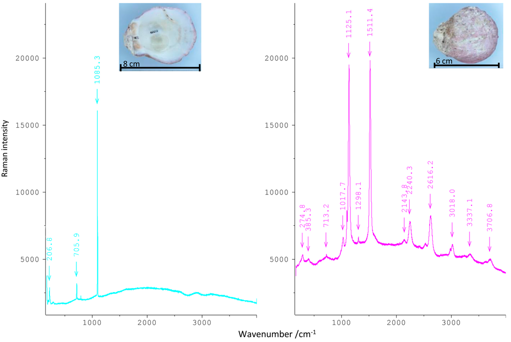 The same effect can be observed on shells (Figure 14), where the inner side of the shell is mostly white and yields a spectrum of almost pure aragonite with bands at 154, 207, 706 and 1085 cm−1, respectively; Eg,ext modes for the two first bands (T, L) and Eg,int (ν4) and A1g,int (ν1) modes for the following. In contrast, the spectrum of the purple colored exterior shows calcitic features at 275 and 713 cm−1. The ν1 and ν2 frequencies at 1511 and 1125 cm−1 of the colorants are so intense that the (CO3)2− band is superimposed. Furthermore, several combinations and overtone bands are visible.