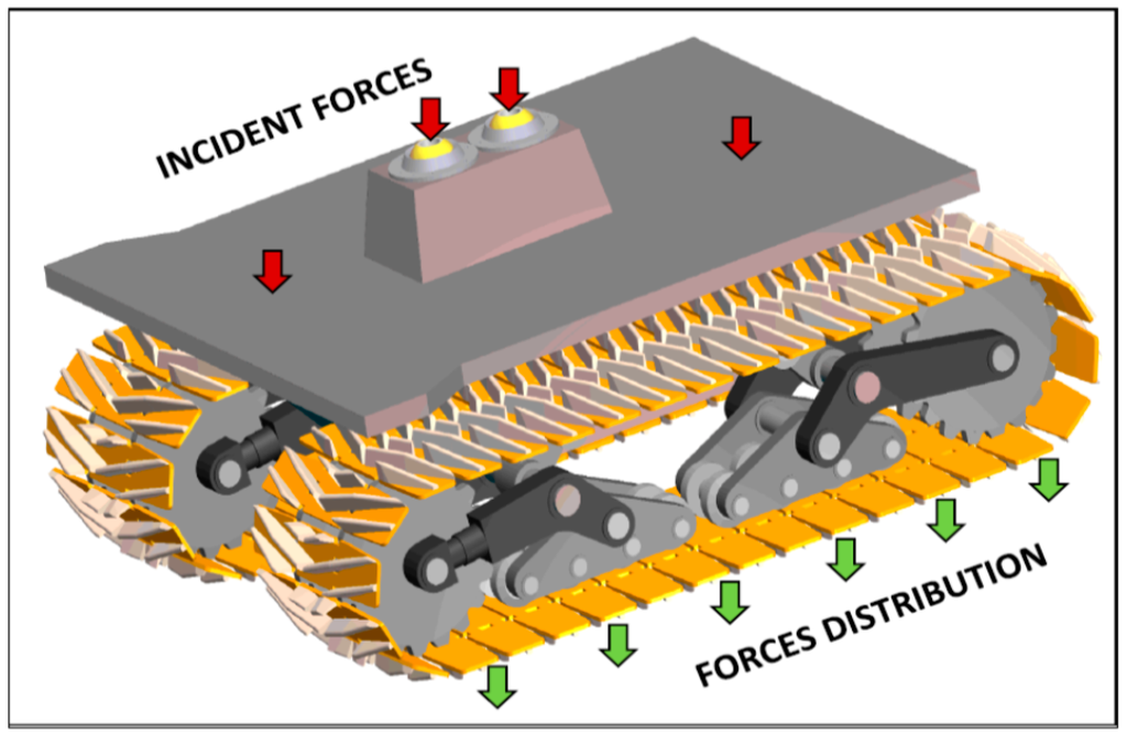 Joint constraints: The spherical and parallel primitive joints are replaced with two revolute joints between rigid–flexible and flexible–flexible crawler shoes.