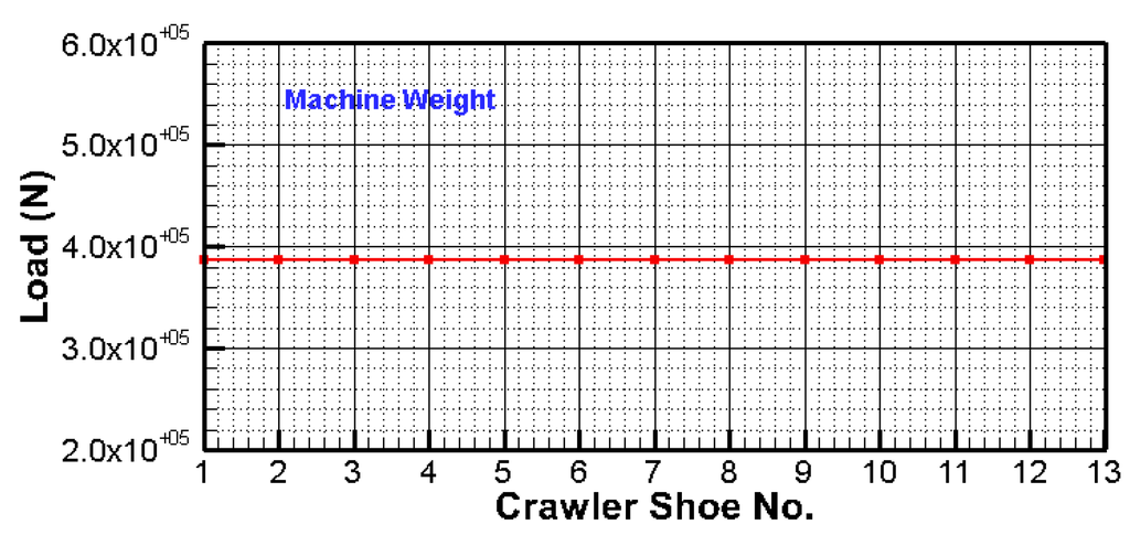 The total load comprises shovel weight (minus crawler weight) and dipper payload. The shovel weight is constant but the dipper payload varies with time and fill factor. The shovel cycle consists of (i) propel to the working face (0 < t < 15 s); (ii) material excavation (15 < t < 22.5 s); (iii) hoisting and swinging from the face to haul truck (22.5 < t < 30 s); (iv) material dumping into haul truck (30 < t < 33.5 s); and (v) swinging after dumping to the digging face (33.5 < t < 40 s). During propel, the load on each crawler shoe is only due to the empty machine weight. The total machine weight for the P&H 4100C BOSS is 1,410,184 kg [1]. The total machine load (excluding crawler shoe weight) for the P&H 4100C BOSS is 630,185 kg. This load is distributed uniformly on crawler shoes 1–13 in Figure 3. Therefore, the machine load/shoe in contact with the ground is equal to 386.4 kN.