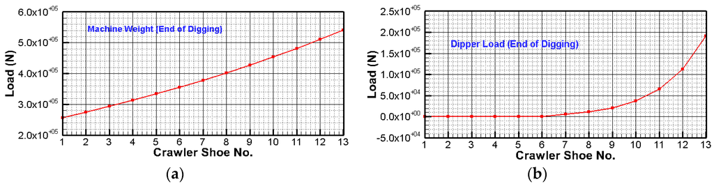 Load distributions on crawler shoes after digging. (a) Machine weight; (b) Dipper Load.