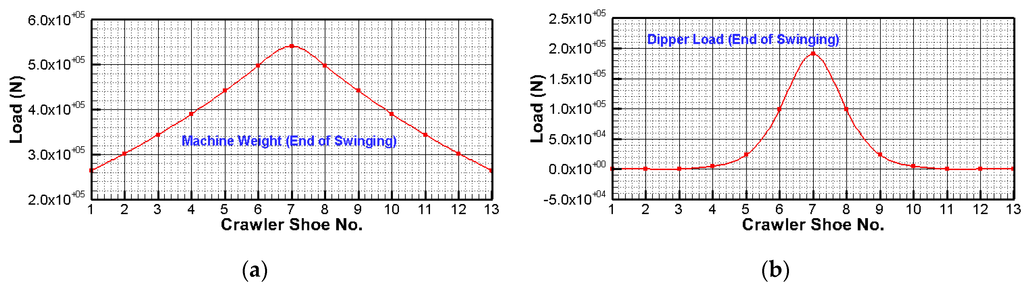 During digging, non-uniform machine and dipper loads act on the crawler shoes. The total dipper weight for the P&H 4100 C BOSS is 890 kN. It is assumed that (i) dipper load is uniformly distributed on the crawler tracks, and thus, dipper load/track is 445 kN; (ii) dipper load acts only on the 7 front crawler shoes; and (iii) shoes 1, 2, 3, 4, 5 and 6 do not support any dipper load and, therefore, the highest dipper load acts on shoe 13 and the lowest on shoe 7. The total distributed load on each crawler shoe is equal to machine plus dipper load, as shown in Figure 4. During swinging, the maximum machine and dipper loads shift to the middle shoes, resulting in symmetric load distribution, with the highest load on shoe 7, at the end of swinging, as shown in Figure 5. During dumping, the dipper load reduces to zero and at the end of dumping, only the symmetric machine load, in Figure 5a, acts on crawler shoes 1–13. During return, the machine load is redistributed and, at the end of return, the uniform load in Figure 3 acts on shoes 1–13.