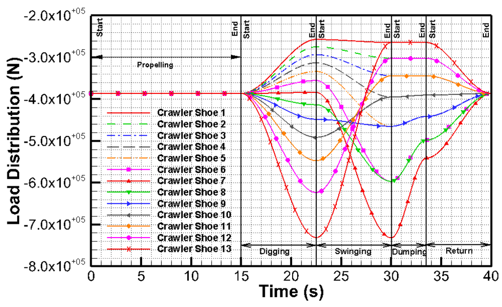 The cubic STEP function defines the total load as a function of load and time. For example, crawler shoe 7 has a total load of (i) 386.4 kN for propel (M); (ii) 384 kN at the end of digging (D); (iii) 732 kN at the end of swinging (S); (iv) 541 kN at the end of dumping (G); and (v) 386.4 kN at the end of return (M). Equation (2) defines the step function for crawler shoe 7.
