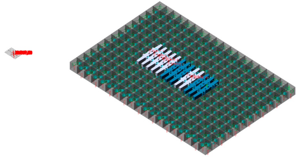 Modal loads: The MNF file contains modal loads for the uniformly distributed machine weight for flexible FEA crawler shoes 6, 7, 8 11, 12 and 13, as shown in Figure 8. These loads are applied using the MFORCE element in MSC ADAMS. The modal loads are scaled as a function of time using the cubic STEP Function in MSC ADAMS, in Figure 6, for shovel propel and loading.