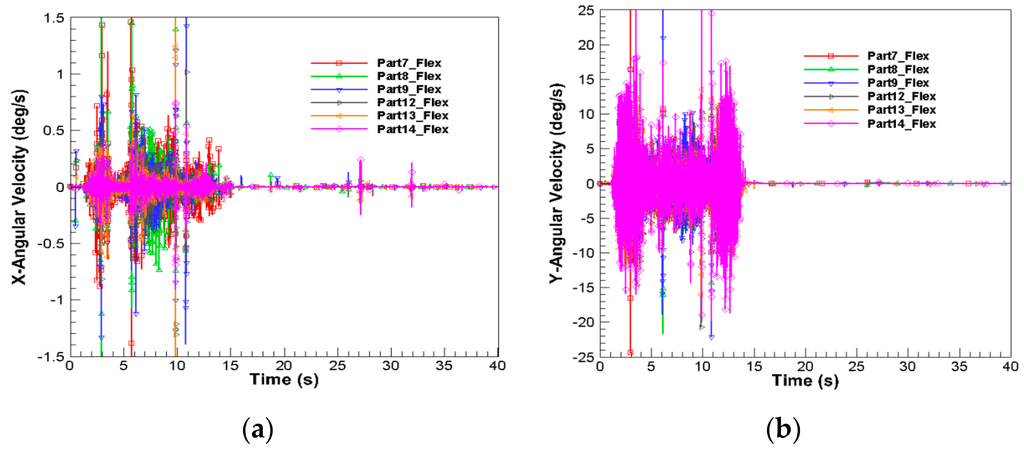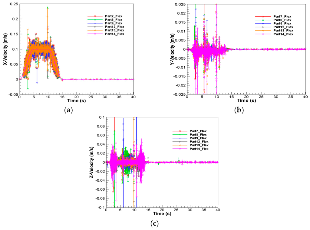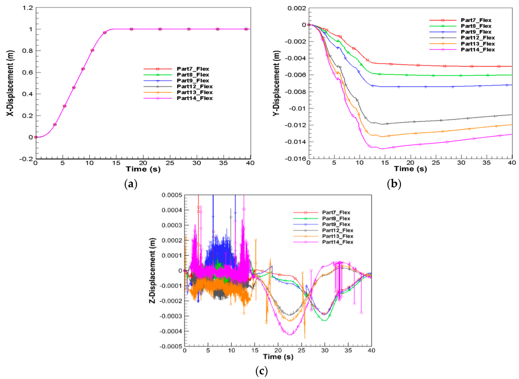 The time variation of von-Mises stresses for the highest nodal stresses (hot spot #1) for each part are shown in Figure 21. The maximum nodal stress on flexible Parts 7, 8, 9, 12, 13 and 14 are 53.6, 33.3, 37.07, 49.55, 103.33 and 172.1 MPa, respectively. Figure 21 shows that the maximum nodal stresses during propel follow the x-reaction force distribution in Figure 15a. Since x-reaction forces are larger on parts 14, 13 and 12 in comparison to parts 7, 8 and 9 (Figure 15a), the maximum nodal stresses are also larger on flexible parts 12, 13 and 14 (Figure 21d–f).