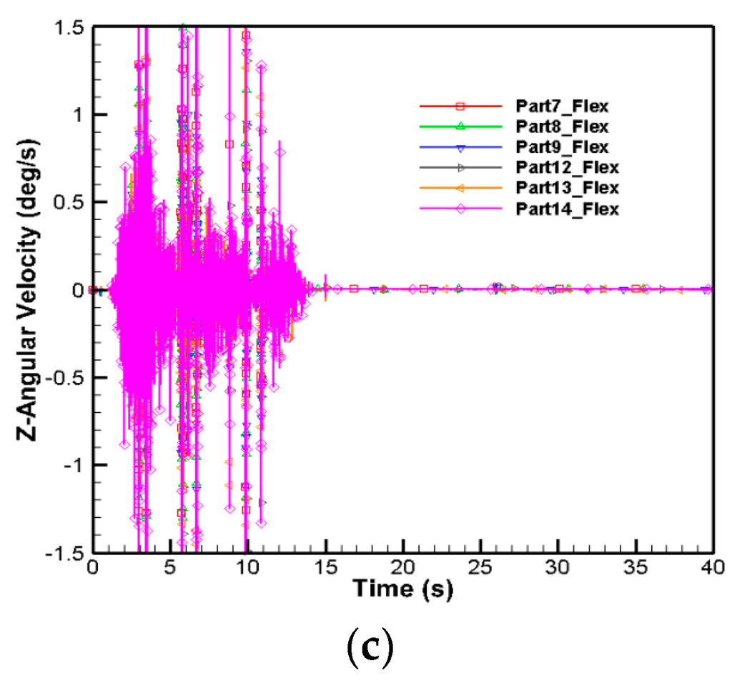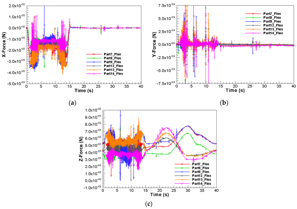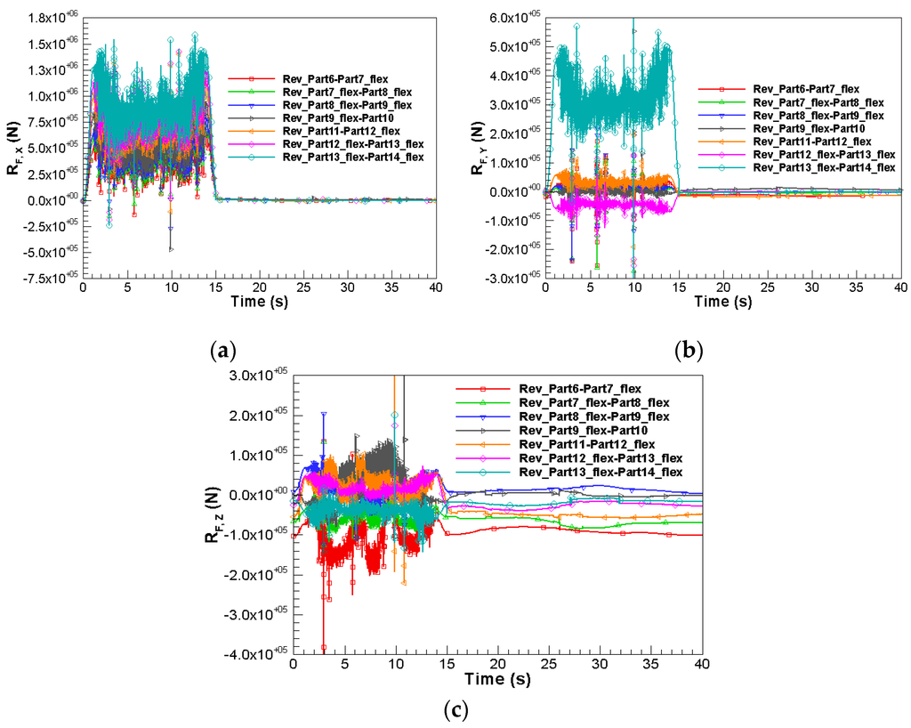 Since the y-force is an order of magnitude smaller than the x-force, the z-torque variation is similar to the x-force (Figure 14a). The maximum magnitude of x, y and z torques are 7 × 106, 1.3 × 107, and 3.7 × 106 N·m, respectively, and are applied as external forces in Equation (4). Figure 15 shows the joint reaction forces at one of the two revolute joint constraints between rigid–flexible and flexible–flexible shoes, with similar forces at the other revolute joint. The reaction force in the x-direction (Figure 15a) is larger than that in the y and z-directions (Figure 15b,c). This is due to the applied motion constraint on flexible shoe 13, which pulls the crawler in the longitudinal direction to simulate shovel propel. The maximum x-reaction force is 1.5 × 106 N in shoe 13 during acceleration and deceleration (Figure 15a). This motion constraint also causes a large reaction force in the y-direction in the joint connecting flexible parts 13 and 14, with a maximum value of 5 × 105 N (Figure 15b). The y-reaction forces in the other joints are smaller, with a maximum value five times smaller than that between parts 13 and 14. The z-reaction force in the joints between the parts in Figure 15c is larger than the y-reaction force, with a maximum value of 2.5 × 105 N. Figure 15c shows that, during loading, a large z-reaction force occurs at the joints, with negligible reaction forces in other directions.