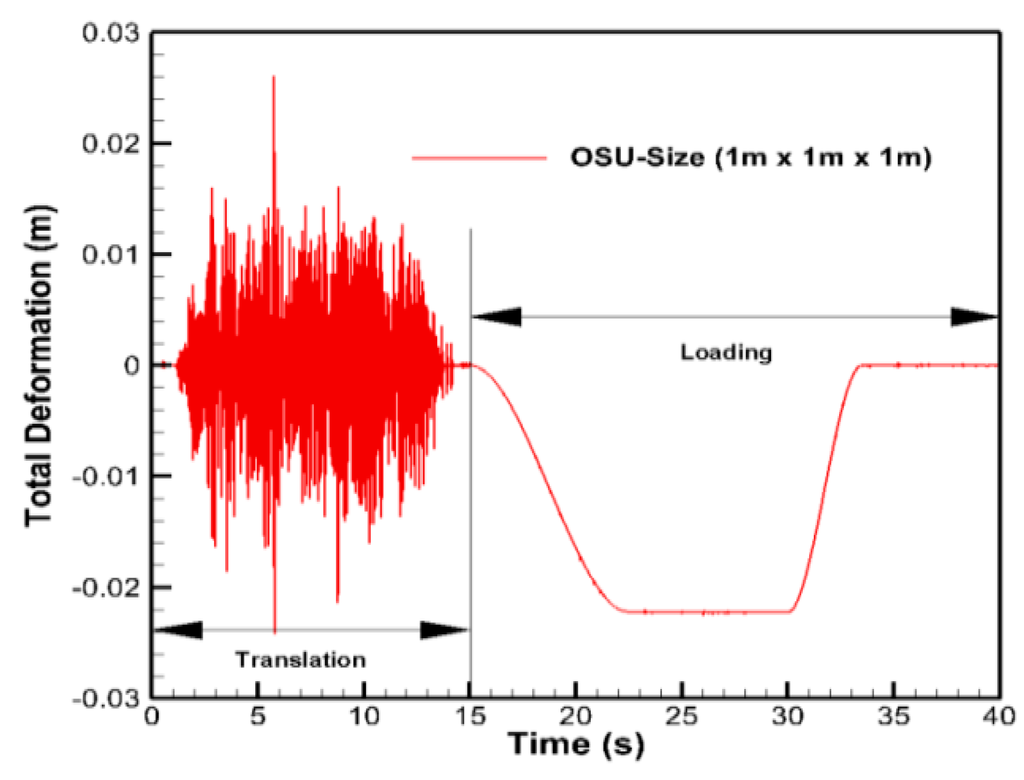The propel and loading deformations range between −2.42 and 2.6 cm, and −2.25 and 0.023 cm, respectively. The largest deformation of 2.6 cm occurs during the constant velocity propel at time t = 5.76 s. The largest loading deformation of 2.25 cm occurs during swinging between 22.5 < t < 30 s.