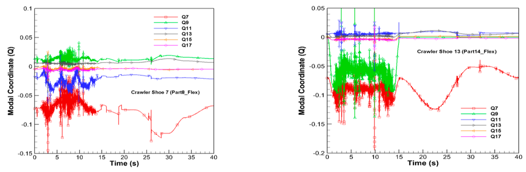 Time variation of modal coordinates for crawler shoes 7 and 13.