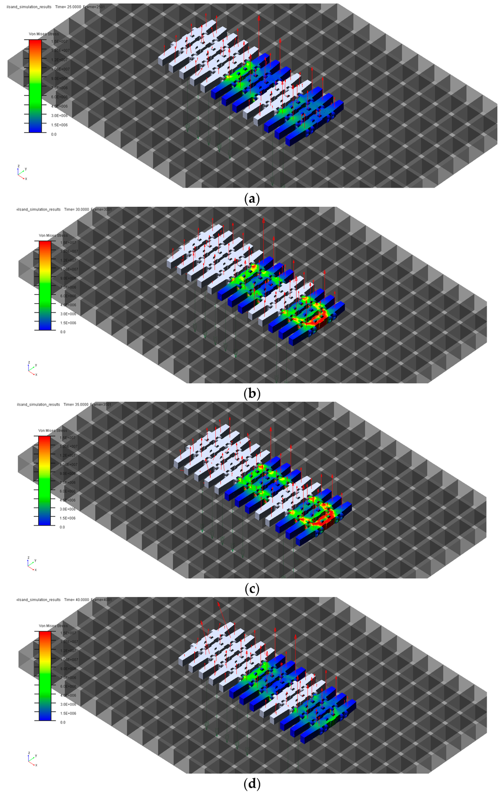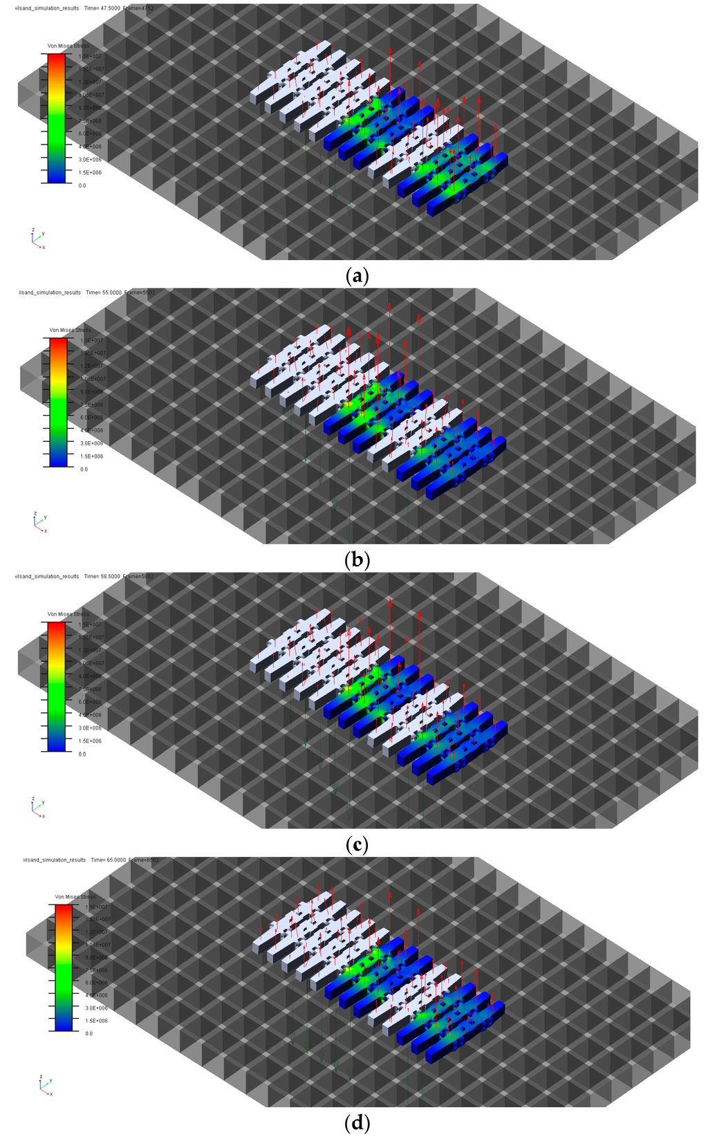 Figure 19 shows the crawler stress distribution during loading. During digging (15 < t < 22.5 s), the stresses increase in the front shoes and decrease in the middle shoes, as shown in Figure 19a. During swinging (22.5 < t < 30 s), the stresses steadily increase in the middle and decrease in the front, as shown in Figure 19b. Figure 19c shows that, during dumping (30 < t < 33.5 s), a small drop in stress is observed in the middle shoes, while a negligible change occurs in the front shoes. In the return phase (33.5 < t < 40 s), a slight decrease in stresses occurs in the middle shoes and increases in the front shoes at t = 40 s (Figure 19d). The stress loading returns to equilibrium at t = 0 s (Figure 18a). Figure 18 and Figure 19 show that the crawler stresses during loading are smaller than those during propel. This is due to the semi-static nature of the external applied load (Figure 6). The shovel is mostly stationary during loading, with a negligible shear motion or slip between the crawler and the ground. These conditions generate high normal forces (Figure 14c) with negligible tangential forces on crawler shoes (Figure 14a,b), resulting in low von-Mises stresses. The modal coordinate distribution in Figure 17 also shows that, during loading, only mode 7 (bending mode caused by normal force in Figure 9) contributes to stresses.