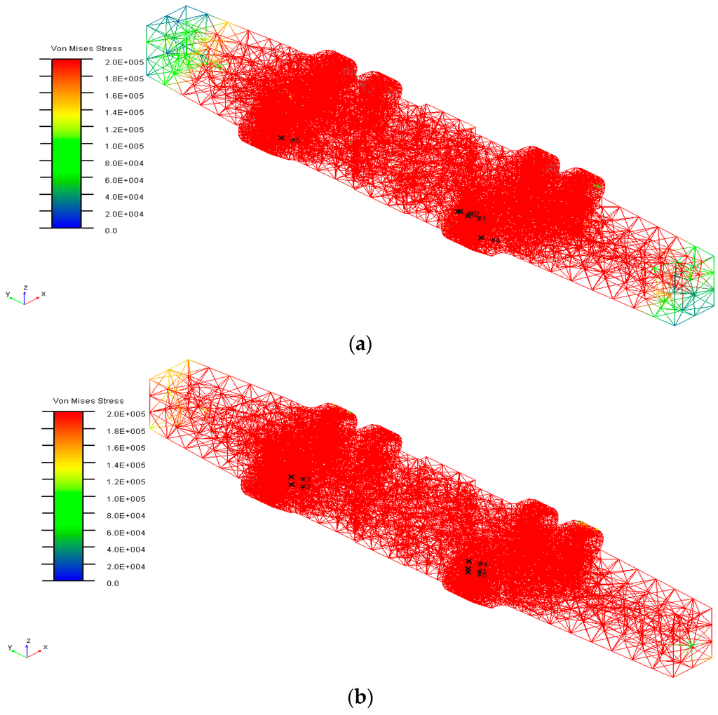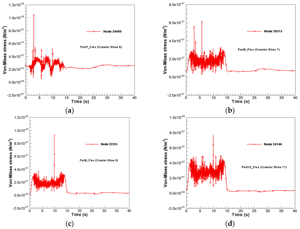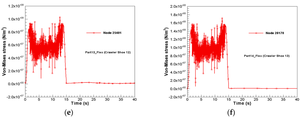 Figure 18 and Figure 19 show the general stress histories during the shovel operation. The maximum nodal stresses and their respective locations in the flexible shoes are extracted from MSC ADAMS/DURABILITY. Figure 20 shows the top five hot spots (highest nodal stress) for flexible shoes 7 and 13 (using marker “x”). The numbers after the marker “x” show the ranks of the stresses. The maximum contour value is 2 × 105 N/m2 for all the flexible bodies, as shown in Figure 20. The figure shows that all hotspots are located around the link pin joints, and not on the main crawler body.