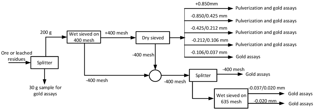 At the end of the leaching, a sample of the solution is taken prior to stopping the agitator. The collected solution is filtered and assayed for gold. The solid residues are filtered, re-pulped with fresh water and filtered again to ensure a complete removal of dissolved gold from the leached ore. The solids residues are sieved and assayed following the procedure shown in Figure 2.