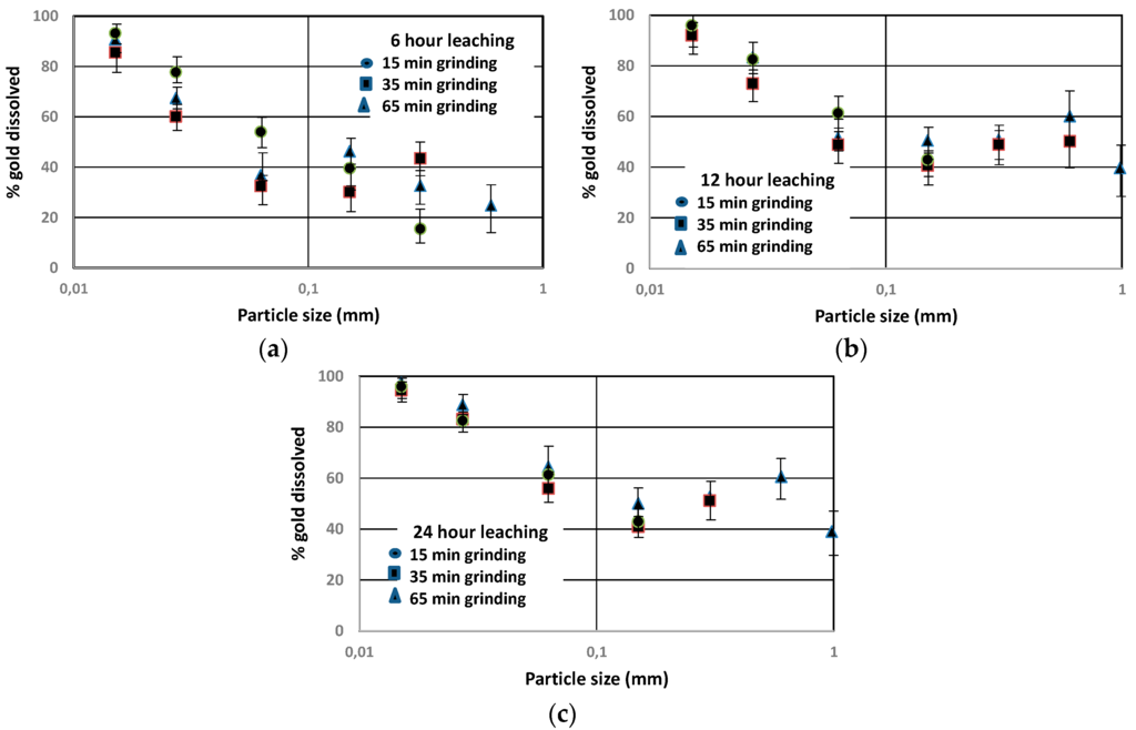 Gold dissolved as a function of particle size and leaching time: (a) 15 min grinding; (b) 35 min grinding; (c) 65 min grinding.