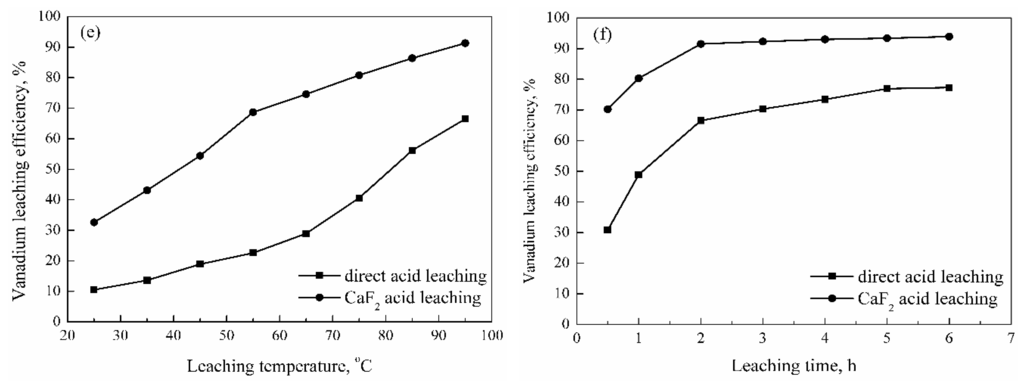 - Li, X.; Xie, B. Extraction of vanadium from high calcium vanadium slag using direct roasting and soda leaching. Int. J. Miner. Metall. Mater. 2012, 19, 595–601. [Google Scholar] [CrossRef]