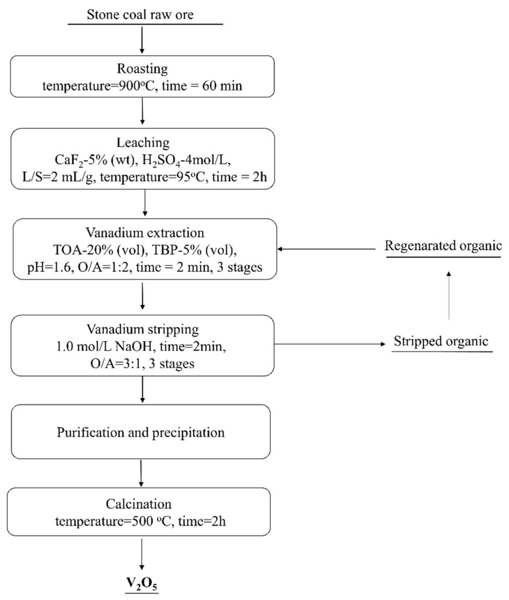 - Zhang, Y.M.; Bao, S.X.; Liu, T.; Chen, T.J.; Huang, J. The technology of extracting vanadium from stone coal in China: History, current status and future prospects. Hydrometallurgy 2011, 109, 116–124. [Google Scholar] [CrossRef]