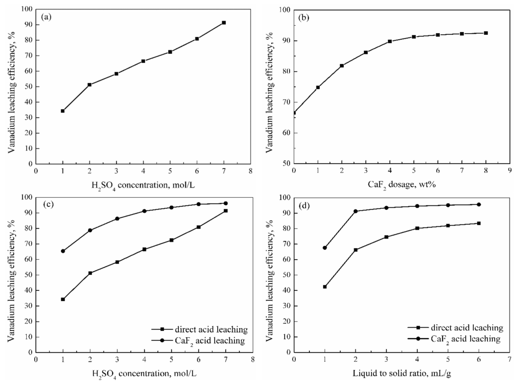 Effect of leaching parameters on vanadium leaching efficiency. (a) Effect of sulfuric acid concentration on vanadium leaching efficiency without CaF2 addition; (b) effect of CaF2 dosage on vanadium leaching efficiency; (c) effect of sulfuric acid concentration on vanadium leaching efficiency with and without CaF2 addition; (d) effect of liquid to solid ratio on vanadium leaching efficiency with and without CaF2 addition; (e) effect of leaching temperature on vanadium leaching efficiency with and without CaF2 addition; (f) effect of leaching time on vanadium leaching efficiency with and without CaF2 addition.