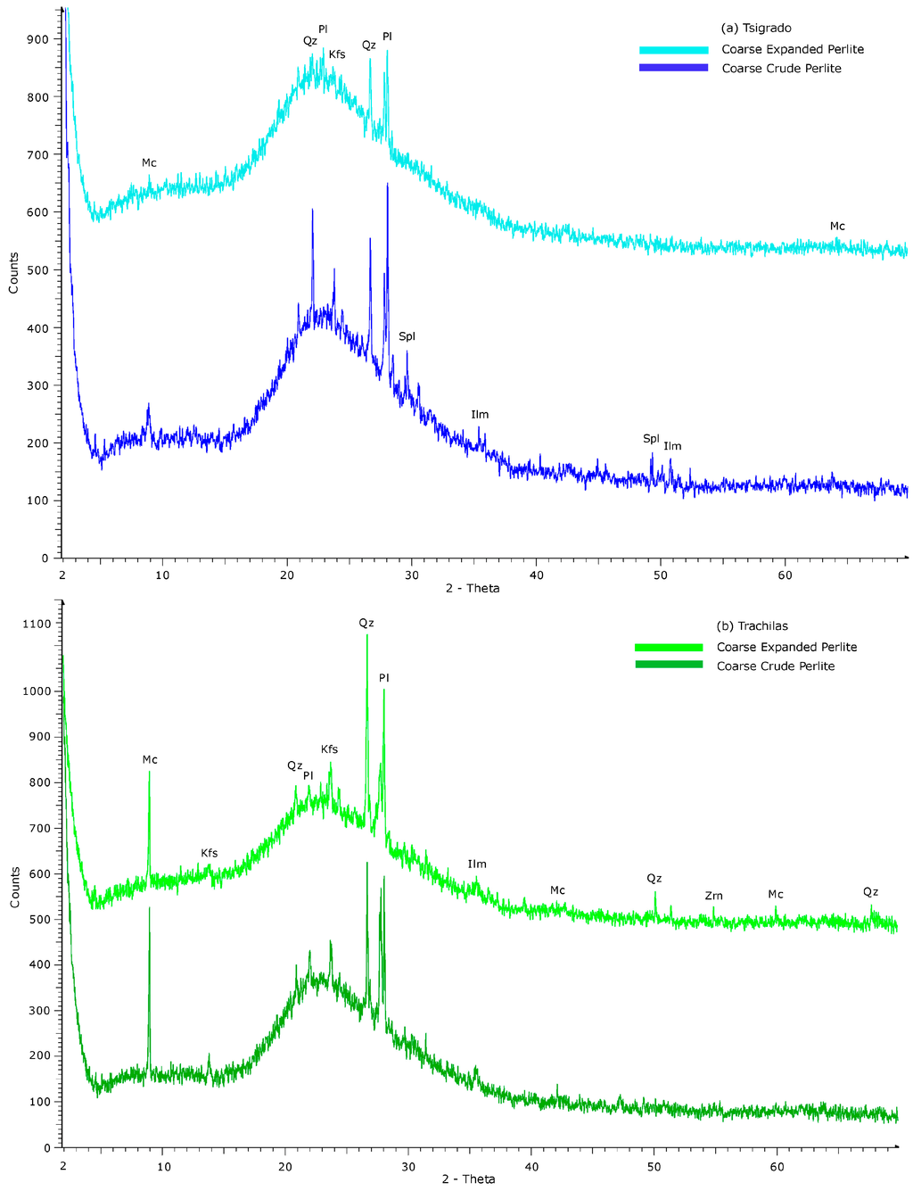 The broad humps between 18° and 30° 2θ on the acquired X-ray diffractograms are assigned to the presence of amorphous, glassy mass, both in the coarse crude and expanded perlite samples from the two areas. The calculated degrees of crystallinity (Ic) in the CCP Tsigrado and Trachilas samples yielded values of 14% and 12%, respectively, indicating the presence of 86% and 88% amorphous phase, respectively. However, the same calculations showed a significant decrease of the crystallinity in the EP Tsigrado sample (7%) relative to the Trachilas EP sample (13%), suggesting an increase in the amorphous phase to 93% for the first sample but a nearly constant value of 87% for the second. Heating is expected to have a slight, if any, positive influence in the crystallinity of the samples; therefore, the absolute values of crystallinity must be considered with care. In any case, an essential relative increase in the amorphous material is observed only in the expanded Tsigardo perlite.