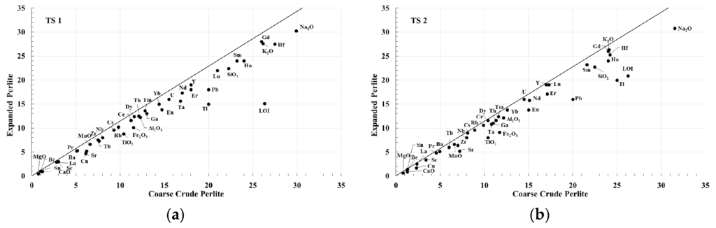 LOI diminishes significantly after expansion (Figure 4, Table S1), presumably because of the loss of combined water, which is the main factor that reinforces perlite expansion. Eu and Sr substitute readily for Ca in the plagioclase structure [19,20]; therefore, their consistent losses reflect the prominent removal of plagioclases in the drops. Losses of Fe2O3 and TiO2 are associated with the removal of ilmenite and biotite from the expanded perlite sample. The loss of Ta is also connected with the removal of ilmenite from the Tsigrado expanded perlite sample, since this high field strength element is known to participate in the structure of Fe–Ti phases [21]. MgO loss from the expanded perlite sample is consistent with the removal of biotite in drops during expansion, whereas the depletion of limited spinel may also contribute to MgO loss. Losses of Zr are related to zircon removal, whereas the losses of Pb (and Cu, which, however, can participate in other sulphides too) reflect the removal of galena from the expanded perlite. Tl loss may be assigned to the removal of K-feldspars and micas after expansion, since it is known to participate in these mineral structures [22,23]; however, limited K, Rb and Ba losses do not substantiate that K-feldspar escape was prominent (see below). Tl and Pb are very volatile elements [24] and perlite treatment temperatures are in the range of their 50% condensation temperature, which strongly suggests that significant amounts of these elements are volatilised partially and escape in the atmosphere.