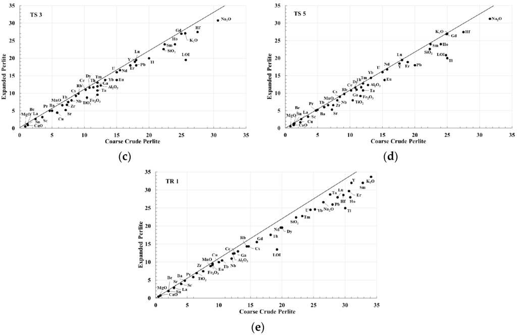 To our knowledge, the isocon method has not been applied previously to an artificial, geochemical modification process. Results from this study suggest that this method can be applied to perlite expansion, provided that a good expansibility has been achieved. Using the isocon method, we obtained a clearer presentation of element mobility during perlite expansion, in which elements are most likely to participate in the amorphous expanded perlite phase and which appear to be associated with mineral and vapour phase removal from the expanded perlite. The use of this method at laboratory scale may predict the unexpandable mineral phases that are released from the coarse crude material during thermal treatment, by assigning the observed mobile elements to certain mineral phases prior to industrial production. In the production plant, where various batches of perlite are treated sequentially, it is not feasible to collect drops individually to calculate mass losses. It is recommended that the methodology presented here can be also applied in other processes of mineral treatment, as it can predict elements that escape to atmosphere either as volatiles or as combined airborne particles with obvious environmental impact.