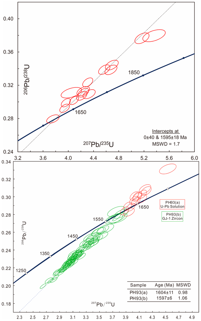 Sample PH-93 was dated at an upper intercept age of 1604 ± 11 Ma with an anchored lower intercept of 0 ± 40 Ma, using a 27-µm spot size and a 12-ppb mixed solution. Sample PH-93 (Figure 5) plots very close to concordia, but displays evidence of slight recent Pb loss like OD10-4. Sample PH-93 was also dated using GJ-1 Zircon as the primary standard, giving an age of 1597.2 ± 6.1 Ma (Figure 5) utilizing 82 of a total of 95 points (Table 4). Although the error is small, the range of discordance is large when compared to the solution analysis, in which spots plot close to or on concordia (Figure 4). The larger spread in PH93 (b) could, however, be due to the larger number of analyses.