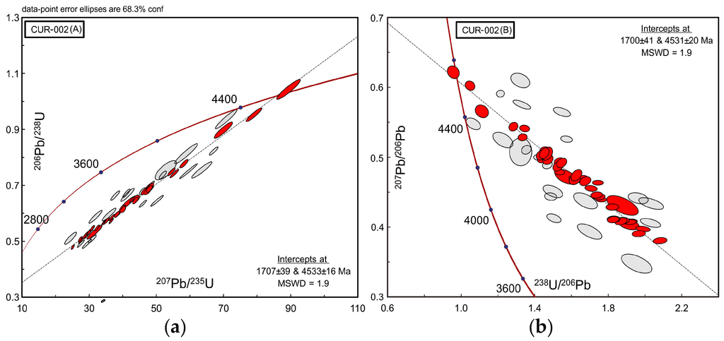 Due to its much lower U concentration (average U is 6 ppm), sample CUR-002 was analyzed using a 60-µm spot size and a 1-ppb mixed solution. The sample contains extremely high 204Pb, exemplified by how far the points plot from the lower intercept on the Tera-Wasserburg diagram. The most robust data points, marked in red, have been included in the age regression (Figure 6, Table 5), which produced a lower intercept date of 1707 ± 39 Ma from 40 out of 60 points. When all data are plotted, an age of 1711 ± 120 Ma is produced, excluding two points that gave 204Pb counts which were too high (>700), and one with measured age ratios which were unrealistically old (point 3) and therefore are not included in either date. Despite high levels of 204Pb, the fitted regression line (from ISOPLOT using the algorithm of York, 1969 [18]) produces a low mean square weighted deviation (MSWD) and relatively low error, demonstrating how even samples of very low U and high common Pb can still give geologically meaningful ages.