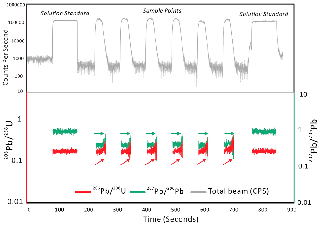 An important result of this study is that when using either the GJ-1 Zircon calibration or the solution method for the same samples (high-U, Olympic Cu-Au Province hematite), the majority of data plot either below or above the concordia. In both cases, however, data points that intercept the concordia are also obtained. Data points above concordia can be attributed to an increase in the 206Pb/238U ratio due to downhole fractionation effects (Figure 7), a phenomenon also observed in zircon spot analysis by Paton et al. (2010) [19]. In this study, such an effect cannot be corrected for via modeling of the downhole fractionation whilst ablating the standard, as the U and Pb analyzed is not contained within the pure α-Fe2O3 matrix ablated, but rather introduced as a solution, and thus the U/Pb ratio remains unaffected by laser induced fractionation during ablation (Figure 7). The results here also place further constraints on the GJ-1 Zircon calibration method, where data points plotting below concordia can be mostly attributed to effects of matrix mismatch (different levels of U fractionation between zircon and hematite). In both cases, however, there is uncertainty about the relative loss or addition of U (open system behavior), which cannot be solved by either method.