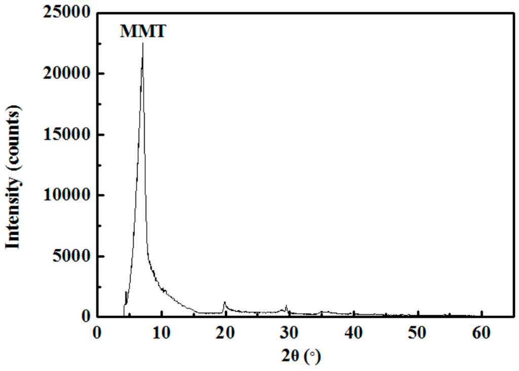 The Na-MMT powder sample was obtained from Chifeng Ningcheng Montmorillonite Co., Inner Mongolia, China. The composition of the sample was characterized using a Bruker D8 Advance X-ray diffractometer (XRD) at a voltage of 40 kV and a current of 30 mA with Cu K radiation (λ = 0.15418 nm). Figure 1 gives the XRD pattern, showing that the purity of the sample is very high grade and only contains negligible impurities.