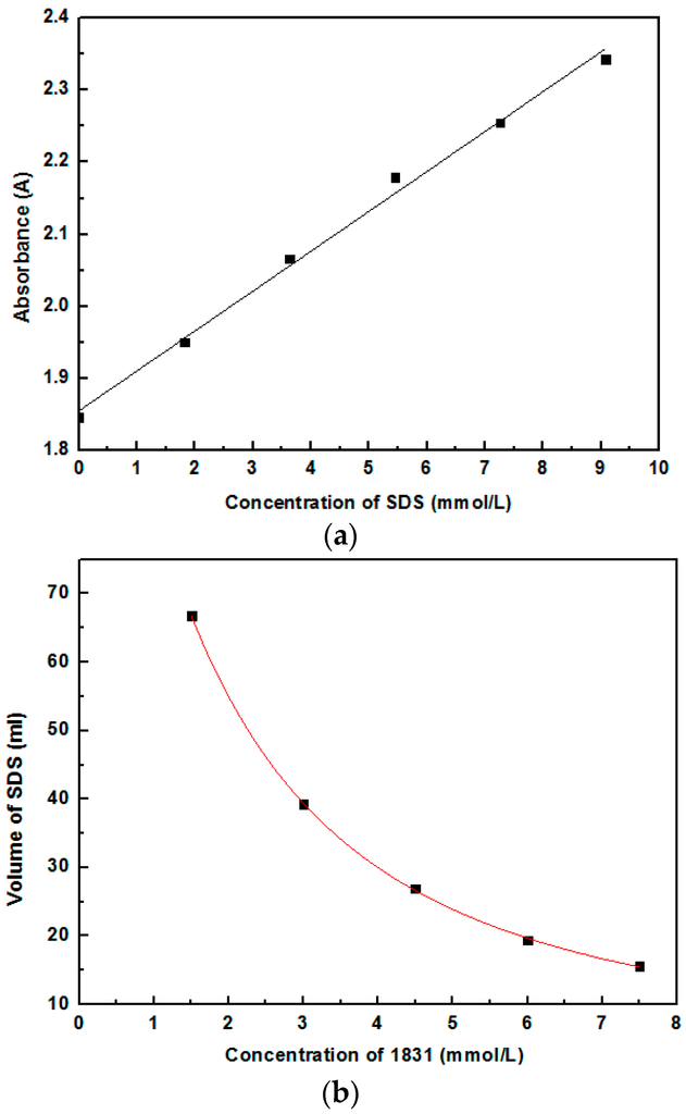 The concentration of 1831 in aqueous solutions was determined by titration. Octadecyl trimethyl ammonium chloride (1831) is one kind of cationic surfactant with the formula C21H46NCl. The titration solution was 1831. The titrate solutions was prepared as follows: 20 mL SDS solutions, 5 mL mixed indicator, 5 mL acidity Na2SO4 solutions, 10 mL deionized water, and 15 mL dichloromethane was poured into a beaker in order. The concentration of SDS was 3 mmol/L. The 1831 solution was dropped into the titrate solutions until the pink phase turned colorless. The amount of the 1831 was equals to the dropped SDS. The standard curve of 1831 is shown in Figure 2b.