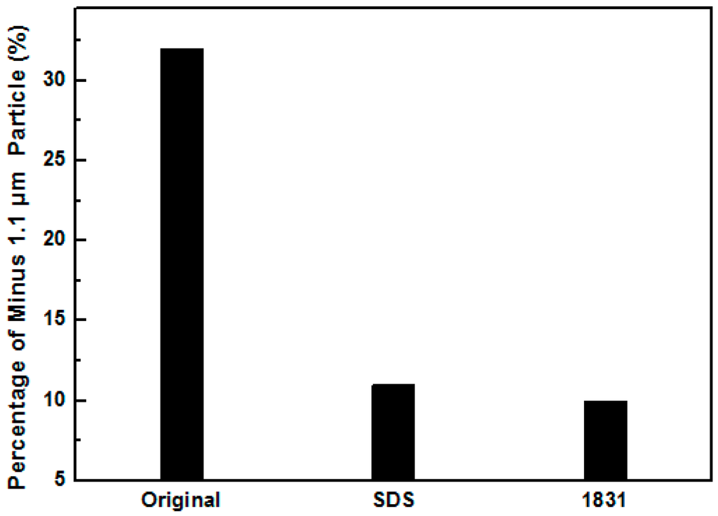 The Stokes size of the MMT in water after adsorbed SDS and 1831 are presented in Figure 3. The Stokes size percentage of −1.1 μm particles of MMT pre-treated by SDS and 1831 was 10.1% and 9.2%, respectively. These two values are much larger than those of original MMT (32.2%), indicating that the Stokes size of the original MMT was finer than that which was pre-treated by SDS and 1831. It means that the delamination was restrained by pre-adsorption of SDS and 1831. The delamination of Na-MMT in water is often caused by the interlayer hydration [6,11,12,13,14,15,16,17,18,19,20]. However, after 1 h mixing in planetary mill, the agent and MMT particles mixed with each other sufficiently. The SDS and 1831 were adsorbed onto the MMT surface and the surface was changed to hydrophobic before the MMT was immersed in water. Then, the water molecule was block out of the interlayer and the interlayer hydration was restrained. In this case, the effect of delamination was weakened by pre-adsorption of SDS and 1831.