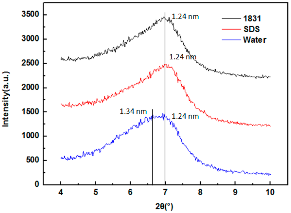 Figure 4 shows the XRD pattern of MMT pre-treated by SDS and 1831. The interlayer spacing of the original MMT and MMT treated by the agent was measured by XRD. The results show that the interlayer spacing of the original MMT is mainly including two different kinds: 1.24 and 1.34 nm. It can be known that the MMT with the interlayer spacing of 1.34 nm was interlayer hydrated and can be delaminated in water. After MMT particles was dried in an electro-thermostatic blast oven at 60 °C, some of the hydrated water molecules of Na+ still remained around [21] and the interlayer spacing was turned to 1.34 nm. It can be inferred that the interlayer counter ions offers the hydration energy for these MMT particles adsorbing water molecules and expanding the interlayer spacing in water. Then, leading to these MMT particles delaminated to fine particles [6,19,20,21]. Figure 4 also shows that the interlayer spacing of MMTs adsorbed with SDS and 1831 are both 1.24 nm, which was less than that of original MMT (1.34 nm). The smaller interlayer spacing can be attributed to the hydrophobization of MMT which can prevent the intercalation of water into the interlayer space. In this case, XRD results confirmed that the interlayer hydration of MMT was restrained by the adsorption of SDS and 1831.