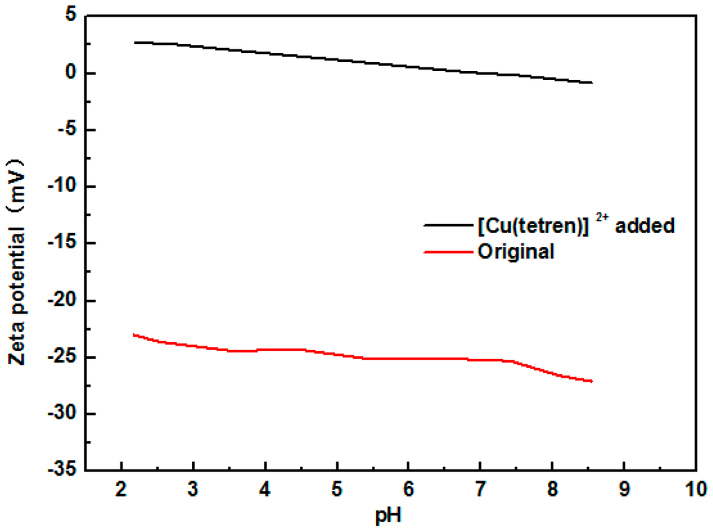 An analogous procedure was followed to obtain the [Cu(tetren)]2+ solutions in deionized water. A 0.01M [Cu(tetren)]2+ solution was prepared by mixing equal volumes of 0.02 mol/L Cu(NO3)2·3H2O and 0.02 mol/L tetraethylenepentamine. 50 mL of the MMT 1 suspension and 150 µL of the [Cu(tetren)]2+ solution were added to a centrifuge tube. After 24 h equilibration with shaking, [Cu(tetren)]2+ was adsorbed onto the plane surface of MMT until saturation to obtain MMT 2 sample. The zeta potential of MMT 2 suspension was measured using a Malvern Zetasizer Zeta-Nano.