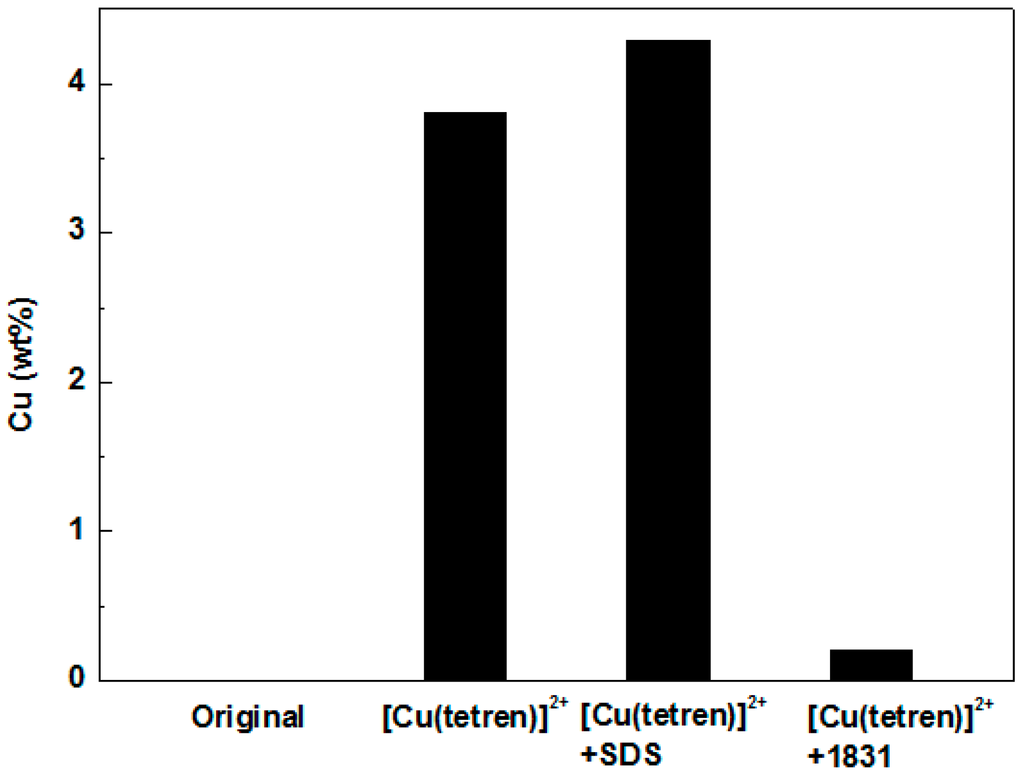 Adsorption position of SDS and 1831 was measured by the adsorption capacity on the different surface of MMT. Firstly, the plane surface of MMT 1 was covered with [Cu(tetren)]2+ to prepare MMT 2. The zeta potential of MMT 1 and MMT 2 are shown in Figure 5. The zeta potential of MMT 2 was around 0 mV, meaning that the plant surface was fully covered with [Cu(tetren)]2+. After that, the adsorption capacity of SDS and 1831 on the surface of MMT 1 and MMT 2 was measured. The adsorption capacity is shown in Figure 6 and Figure 7, respectively, and, the content of Cu adsorbed on MMT 2 surface after being treated by SDS and 1831 are shown in Figure 8. The results show that the adsorption capacity of SDS and 1831 was similar before and after the MMT adsorbed [Cu(tetren)]2+. However, the content of Cu on MMT 2 treated by SDS was much higher than that of treated by 1831. These results indicated that the [Cu(tetren)]2+ adsorbed on the plant surface can be replaced by 1831, but cannot be replaced by SDS. Because the SDS adsorption capacity was similar before and after the MMT was adsorbed with [Cu(tetren)]2+, it can be known that SDS cannot be adsorbed on the plant surface of MMT. Thus, the adsorption capacity of SDS on the MMT surface can be attributed to the adsorption on edge surface. Since the [Cu(tetren)]2+ adsorbed on the plant surface can be replaced by 1831, it means that 1831 was adsorbed on the whole surface of MMT. Since the MMT cannot be delaminated in water after being treated with SDS, then, the delamination of MMT can be restrained as long as the surfactant was adsorbed on the edge surface of MMT.