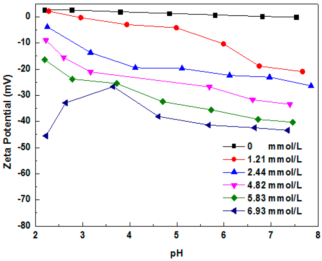 Zeta potential of MMT samples immersed in different concentration of SDS solutions with various pH values.