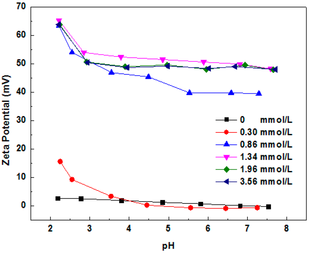 Figure 10 shows the zeta potential of MMT 2 in different concentrations of 1831 solutions. The results show that the zeta potential of MMT 2 will decrease with the increase of 1831 concentration when the 1831 concentration lower than 0.30 mmol/L. When the concentration of 1831 is higher than 0.30 mmol/L, the zeta potential will increase with the increase of 1831 concentration. This result reconfirmed that the 1831 can adsorbed onto the whole surface of MMT. At the beginning, the [Cu(tetren)]2+ was adsorbed on the plane surface of MMT 2. As one kind of cationic surfactant, the 1831 will adsorb onto the plane surface of MMT and the [Cu(tetren)]2+ will be replaced when the concentration of 1831 is lower than 0.30 mmol/L. The valence of 1831 is +1, which is smaller than that of [Cu(tetren)]2+, leading to the decrease of positive charge on the plane surface of MMT. After the concentration of 1831 is raised higher than 0.30 mmol/L, the zeta potential of the 1831 increased as more of the 1831 molecule was adsorbed onto the whole surface of the MMT 2. Thus, the 1831 was adsorbed on the whole surface of MMT.