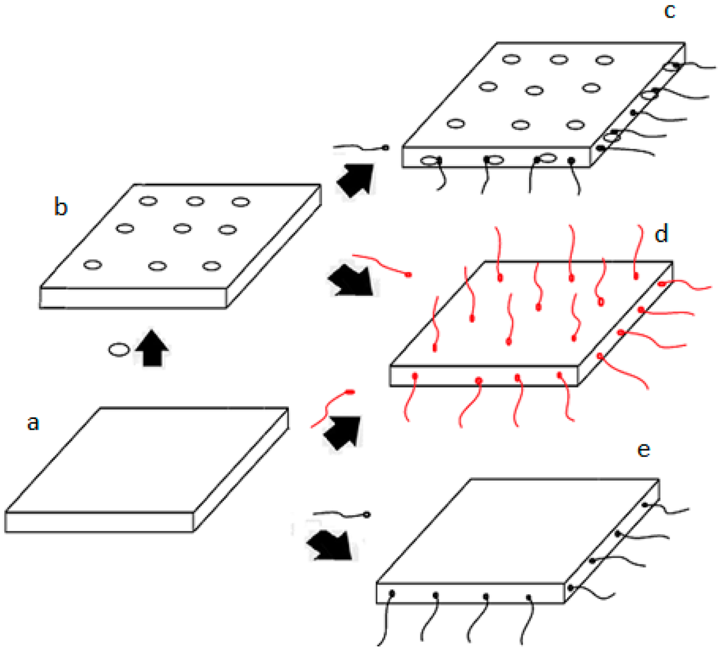 In summary, the adsorption position of SDS and 1831 on the surface of MMT are show in Figure 11. Figure 11 shows the original MMT particles, the adsorption position of [Cu(tetren)]2+, the co-relationship of adsorption of SDS and [Cu(tetren)]2+, the adsorption position of 1831 on the surface of MMT, the adsorption position of SDS, respectively. The experiential results in Figure 11d,c indicate that the [Cu(tetren)]2+ adsorbed on the plant surface can be replaced by 1831 but cannot be replaced by SDS, and the [Cu(tetren)]2+ can be adsorbed onto the edge surface of MMT caused by the adsorption of SDS on the edge surface, as shown by Figure 11c. Therefore, SDS was only adsorbed on the edge surface of MMT and 1831 was adsorbed both on the edge surface and plant surface of MMT, meanwhile, as shown in Figure 11e,d, respectively.
