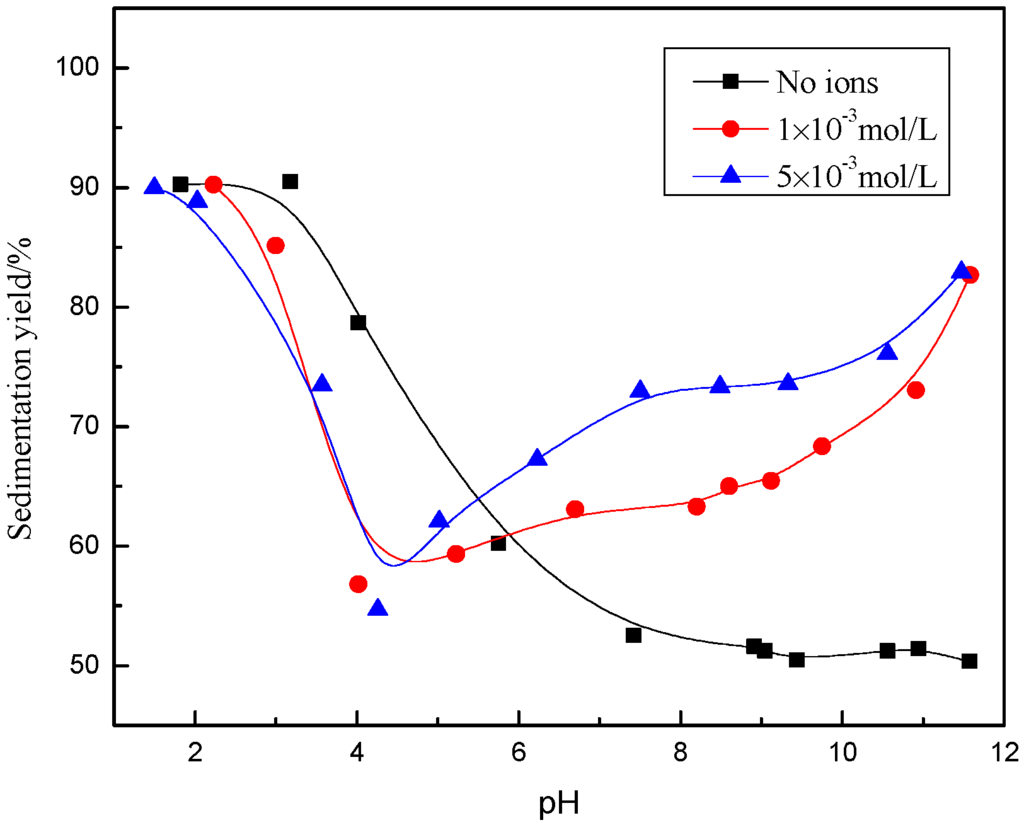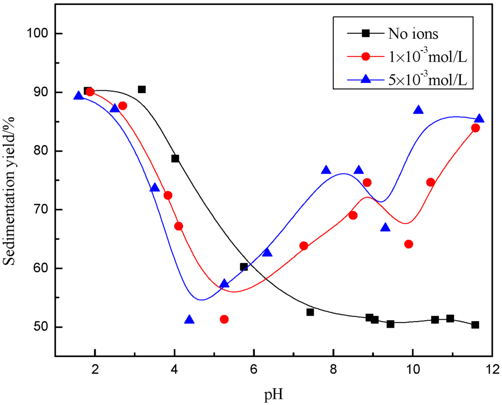 It can be seen from Figure 2 and Figure 3 that, in the absence of excess Ca2+ and Mg2+ ions, the sedimentation yield of the sample decreased with increasing pH, within a range from 1 to 6, after the yield was around 50% in a pH range from 6 to 12, indicating that the muscovite particles aggregated in an acidic solution and dispersed in alkaline suspension.