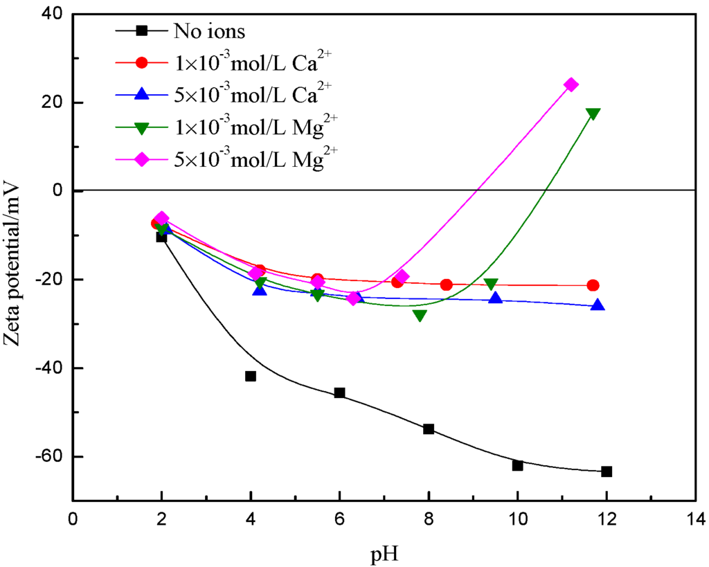 The zeta potentials of the sample in the different suspension were measured by Zetasizer Nano ZS90 (Malvern Instrument Co., Malvern, UK). The sample (2 mg) was placed in 100 mL of deionized water, and the suspension was conditioned with Ca2+ or Mg2+ ions over the pH range from 2 to 12. An average zeta potential value of at least six individual measurements was recorded.