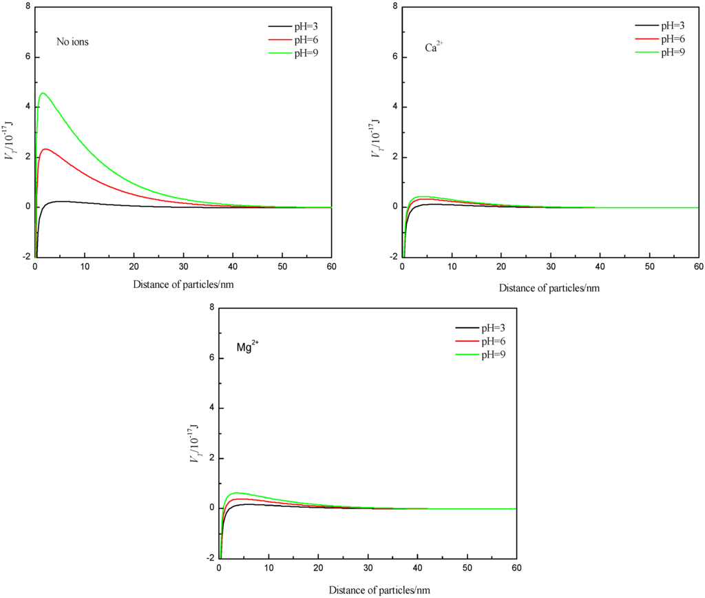 Assuming spherical particle geometry, the interaction energy values of the particles in the presence or absence of Ca2+ and Mg2+ was calculated according to the classical DLVO theory, with the results from the zeta potential measurements, and the Hamaker constant of A131 = 2.2 × 10−20 J, the dielectric constant of ε = 6.95 × 10−10 C2·J−1·m−1, κ = 0.104 nm−1 [28,29], and R1 = R2 = 10.75/2 μm. As can be seen from the results in Figure 5, the energy barrier increased with increasing pH, so the ability to from a dispersion was improved with increasing pH, which was found to be consistent with the settling experiments. However, the presence of Ca2+ and Mg2+ can reduce the surface potential and thus reduce the interaction energy values of the particles. This should increase flocculation, but it is in contrast to the experimental results presented earlier.