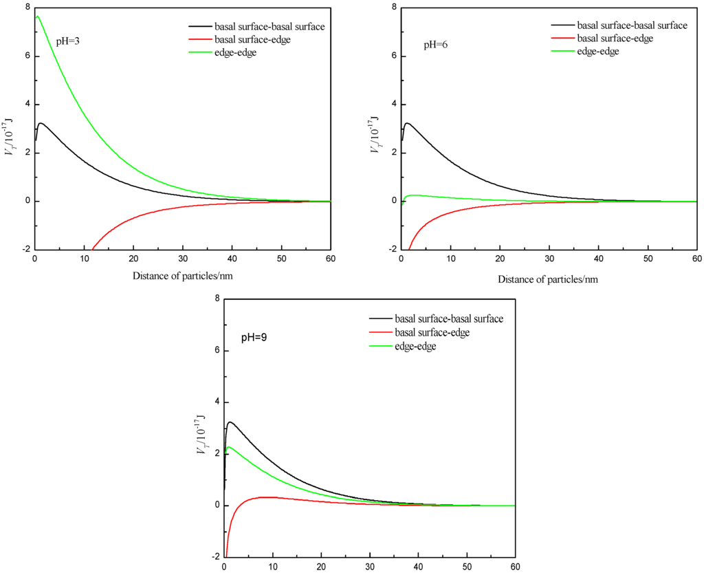 Muscovite is a kind of layered crystal structure of mineral, which is formed from an octahedral layer sandwiched between two identical tetrahedral (SiO4) layers. So particle–particle flocculation may occur through three types of structural interaction: basal surface (001)—basal surface, basal surface-edge, and edge-edge. In general, the measurement of zeta potential can represent the mineral surface electrical property; however, considering the crystal anisotropy of muscovite, the zeta potential of muscovite is the overall electrical properties of the basal surface and the edge. The basal surface of muscovite has a negative charge, which is not affected by pH [31]. As a result, its value can be approximated to the zeta potential when the pH value of the suspension is equal to the point of zero charge of the edge (PZCedge). When the net charge of the surface is zero, the PZC is defined as a point on the pH-scale, and the PZCedge of muscovite in theory is 6.84 [34]. The potential computation formula of the edge is as follows: . Considering the smaller edge area compared to the basal surface area, the Redge was assumed to be one tenth of the Rbasal·surface(10.75/2 μm). The interaction energy values of the particles were re-calculated, and the results are shown in Figure 6. The results show that the interaction energies of the form of basal surface-edge were negative at pH values of 3 and 6, which means that the particles can undergo flocculation, consistent with the experimental phenomenon, testifying that the particles were aggregated in acidic suspension mainly by the form of the basal surface-edge. Adding the 1 × 10−3 mol/L Ca2+ and Mg2+, the surface potential was reduced, and the electrostatic attraction between the basal surface and the edge was then also reduced, so the dispersion increased, which was also consistent with the experimental phenomenon.