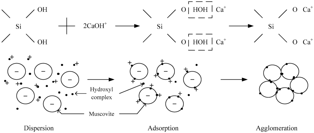- The hydroxy complex of Ca2+ and Mg2+ was the main adsorption form on the mineral surface. The flocculation of muscovite was caused by a bridging effect of the hydroxy complex, which destroyed the excellent dispersion stability in alkaline suspension.