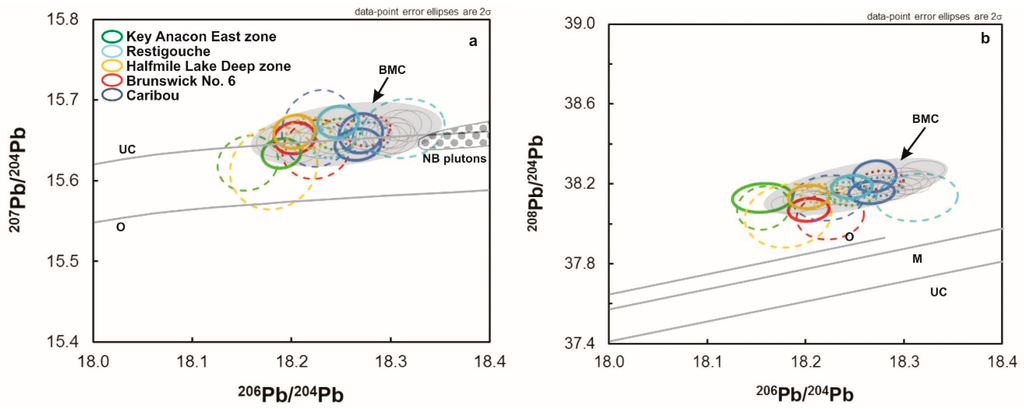 The data are reported herein as drift and externally corrected values relative to Broken Hill galena standard with fully propagated 2σ (95% CI) errors on the weighted means. Weighted means were calculated by Isoplot for the 206Pb/204Pb, 207Pb/204Pb, 208Pb/204Pb, 207Pb/206Pb and 206Pb/208Pb ratios. The mean 202Hg ion beam in galena was <10 cps, whereas 207Pb was ~3.0 × 106 icps (integrated count per second). The data for the BMC samples show a range of Pb isotope ratios that are unique to each deposit, consistent with the previously documented array of Pb-isotope values recorded for the BMC. This array of values is distinguishable at both 44 µm and 60 µm crater diameters, with the latter having better precision. The results are plotted on conventional 207Pb/204Pb vs. 206Pb/204Pb and 208Pb/204Pb vs. 206Pb/204Pb diagrams, showing the variation of Pb isotopic ratios based on the [48] (Figure 6) and relative to the terrestrial Pb-isotope growth curve [49] and other terrestrial reservoirs from [48]. Error correlations between 206Pb/204Pb vs. 207Pb/204Pb and 206Pb/204Pb vs. 208Pb/204Pb are currently not reported by VizualAge, but estimated correlation coefficients of 0.0003 and 0.001, respectively, were calculated from each final corrected dataset. An error correlation of 0.1 was assumed for the conventional data for the BMC. The results of galena ablation with 44 µm crater sizes shows that galena from Restigouche yields the most radiogenic 207Pb/204Pb ratio (15.697), whereas galena from Key Anacon East zone yields the lowest 207Pb/204Pb ratio (15.595). The 208Pb/204Pb ratio is highest in galena from the Restigouche deposit (38.140) and the lowest in galena from Halfmile Lake Deep zone and Brunswick No. 6 (38.000). The 206Pb/204Pb results are highest in galena from Restigouche (18.320) and the lowest in galena from Brunswick No. 6 (18.123).