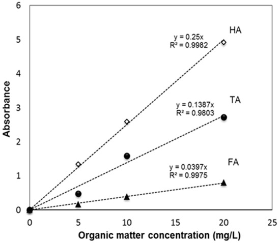 Absorbance versus concentration of humic acid (HA), tannic acid (TA) and fulvic acid (FA) (NaCl 10−2 M; pH 9.3).
