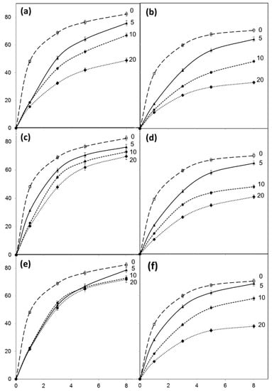 Cumulative recoveries as a function of flotation time and organic matter concentration (mg/L) for chalcopyrite with HA (a); TA (c); and FA (e) and for molybdenite with HA (b); TA (d) and FA (f) (pH = 9.3).