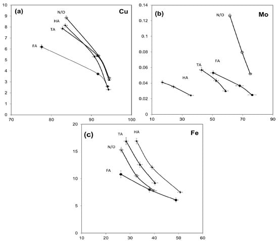 Grades versus recoveries of Cu (a); Mo (b); and Fe (c) in the bulk Cu–Mo flotation concentrate without (N/O) and with the addition of 20 mg/L of organic matter at pH 10.5.