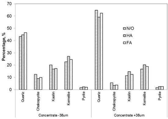 The quantitative chemical composition (by XRD analysis) of the bulk Cu–Mo concentrates for the −38 and +38 µm fractions is shown in Figure 4. The results confirm the decrease of chalcopyrite flotation and the increase of pyrite flotation after the addition of HA and FA. The −38 µm fraction of the concentrate has a higher percentage of quartz and kornelite and less kaolin with HA and FA addition, while the +38 µm fraction has a higher percentage of kaolin and kornelite and less quartz than in the concentrate without HA and FA.