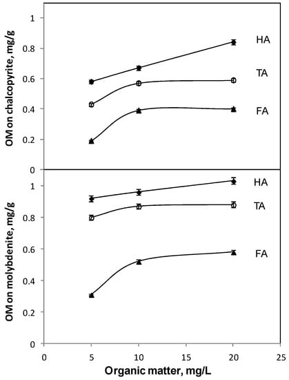 Concentration of OM adsorbed on (top) chalcopyrite; and (bottom) molybdenite (NaCl 10−2 M, pH 9.3).