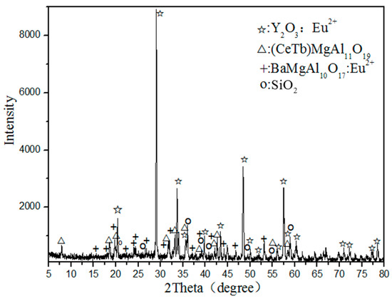 The waste phosphors used were mercury-free waste phosphors supplied by a Peiyuan Lighting Materials Co., Ltd. (Jiangzhou, China). The composition of the samples was analyzed by X-ray fluorescence (XRF) and the results are shown in Table 1, indicating that the total content of rare earth elements is 22.93%—including Y, Eu, Ce, and Tb. Content of Si is 24.97% which is much higher than expected for the phosphors, which is probably due to a certain amount of Si from the fluorescent tubes.