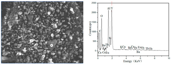 Figure 2 and Table 2 show the Scanning Electron Microscope-Energy Dispersive Spectrometer (SEM-EDS) image of waste phosphors, in which the large granular particles are fragments of fluorescent tubes (Point-4), the elements presented in these particles were mainly Si and O, the bright particles were red phosphors (Point-3), the main elements were Y and O, Point-1 and Point-2 were blue and green phosphors; the main elements were O, Al, etc.