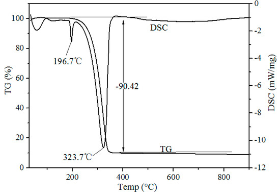 Thermogravimetric-Differential Scanning calorimeter (TG-DSC) curves of waste phosphors mixed with NH4Cl on a mass ratio of 1:4 after chlorination roasting at atmospheric pressure are shown in Figure 3. Two endothermic peaks at 196.7 and 323.7 °C were observed in the DSC curve. The endothermic peak at 193.1 °C was due to the release of adsorbed water of NH4Cl. The endothermic peak at 323.7 °C was due to the decomposition of the NH4Cl shown in Formula (1). During the roasting process, HCl is in the form of gas, generated from the decomposition of ammonium chloride, and waste phosphors react with HCl to form rare earth chlorides (Formula (2)). TG and DSC curves indicate that chlorination roasting temperature is an important factor in determining the metal leaching efficiency.