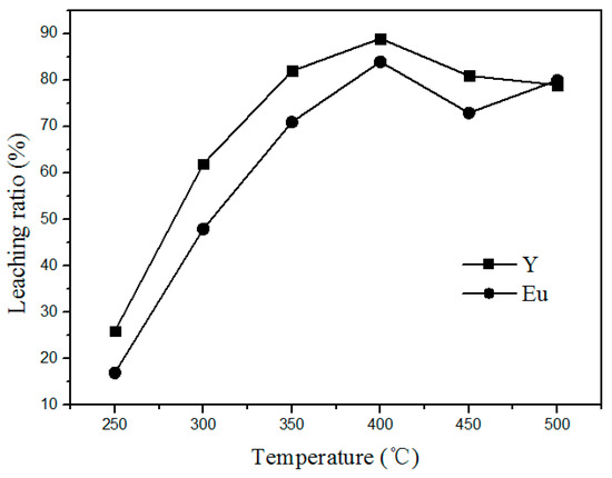 The effect of chlorination roasting temperature on the leaching rate of Y and Eu from waste phosphors was carried out at a mass ratio of 1:4 (waste phosphors to NH4Cl) for 90 min. Related results are shown in Figure 4. It shows that the Y and Eu leaching efficiency increases rapidly from a low value at 250 °C to the maximum at 400 °C. As expected, high temperature promotes the decomposition of waste phosphors. However, above 400 °C, leaching ratios clearly decrease because the reaction shown in Formula (1) becomes vigorous, leading to the significant generation of HCl into the air, decreasing the amount of HCl for phosphor decomposition. Moreover, the higher quantity of HCl generated also causes severe environmental pollution. To decrease energy consumption and avoid air pollution, roasting temperature should be controlled within 400 °C.