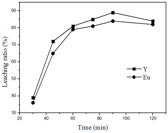 Additionally, the time of roasting is another important factor that influences the leaching process. Figure 5 shows the variation in the leaching rate of Y and Eu at different roasting times at 400 °C and a mass ratio of 1:4 (waste phosphors to NH4Cl). The leaching rate increased with increasing leaching time by 30–90 min. Above 90 min, the variation in the leaching rate is insignificant. Therefore, the optimum time for the leaching process is 90 min.