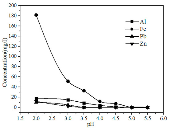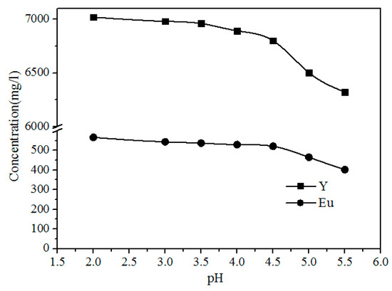 As shown in Figure 9, the concentration of Fe, Al, Pb, and Zn clearly decreases with increasing pH because the Pb2+ and Zn2+ were precipitated with S2−, and Al3+ and Fe3+ were hydrolyzed with increasing pH via the reactions shown in Formulas (3)–(6). The concentrations of Y and Eu do not decrease until the pH exceeds 4.50 (Figure 10). The pH required for the hydrolysis of Y and Eu is higher than those of Al and Fe, thus the impurities can be separated by adding a Na2S and NH3·H2O solution to adjust the pH value to 4.5.